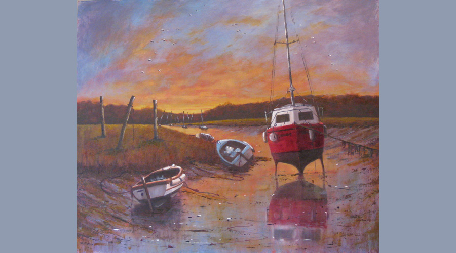 I studied fashion at the Portsmouth College of Art and after a short period of teaching became self employed with various craft businesses. I spent over 30 years in the West Country, moving back to Berkshire five years ago, and I am now able to paint full time. My inspiration is obtained from visiting different areas of England, the skies of Norfolk, hills of Cumbria, granite coast of Cornwall and the rolling hills of the Southdowns, with water, in various forms continuing to seep into much of my work. I try to capture the dramatic atmosphere in oils and acrylics as the light and colours change through the seasons.